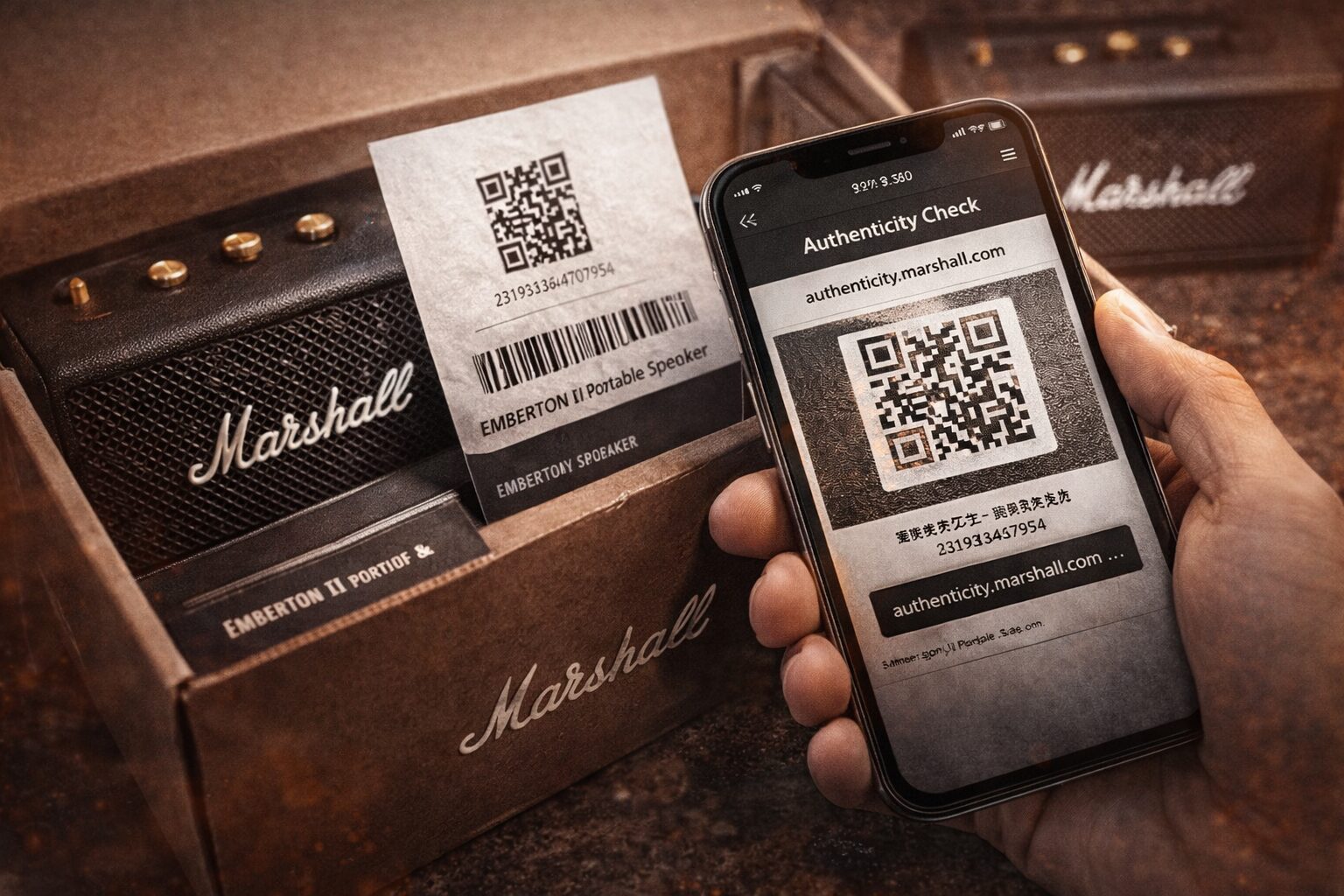2026年以降の新しい世代では、MarshallがQRコードによる認証システムを導入しています。これは今のところ、マーシャルのスピーカー偽物を確認するうえでかなり実用的な方法のひとつです。対象製品の外箱にQRコードが付いている場合は、スマホで読み取り、表示された番号と箱の番号が一致するかを確認してみてください。外観比較よりも情報の信頼性が高く、購入後の不安を整理しやすいです。ここ、かなり大きなポイントですよ。