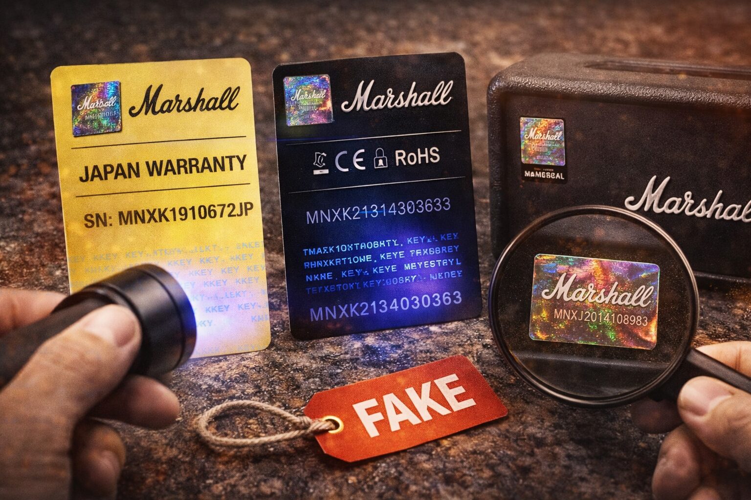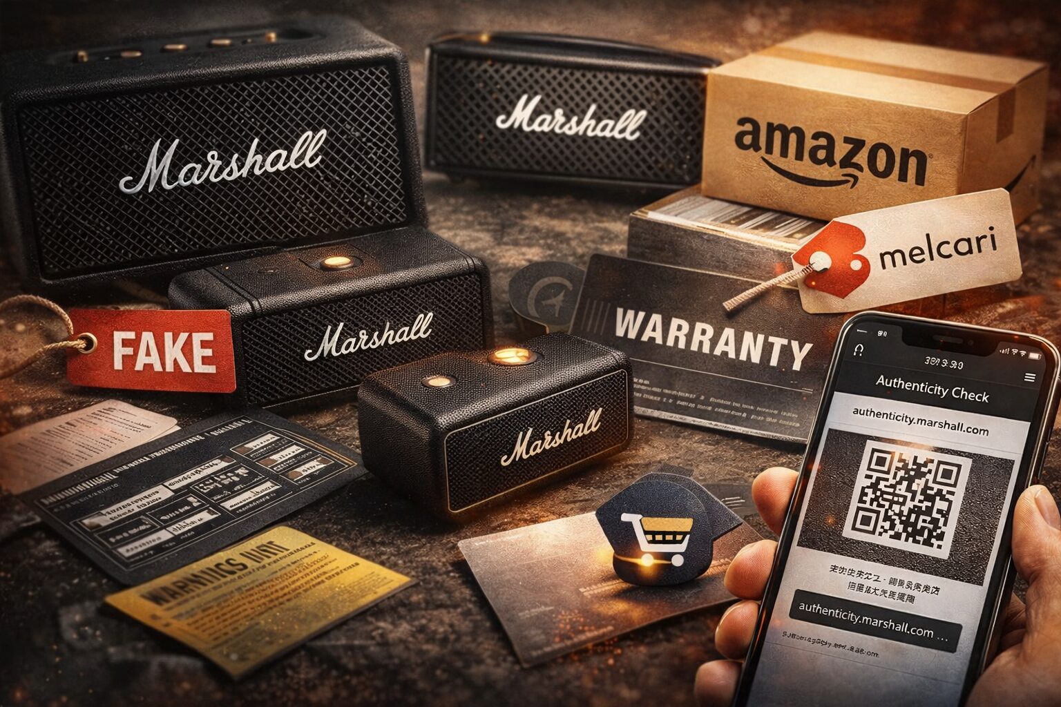 そこで大事になるのが、どこで買ったか、どんな流通経路か、購入後にどんなサポートが受けられるかという視点です。Marshall公式は、偽造品が市場に出回っていることに触れつつ、本物を確実に入手する最善の方法は公式サイトや正規販売店から直接購入することだと案内しています。さらに、模倣品は品質保証や安全性テストを受けていない可能性があるため、不審な場合は購入元への返品相談をすすめています。この考え方はすごく本質的で、見た目の差探しよりも先に、信頼できる購入先かどうかを確認するほうがはるかに精度が高いんです。